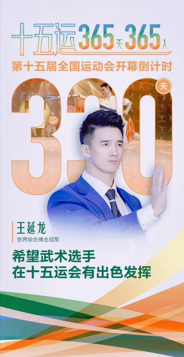 这是第十五届全国运动会开幕式倒计时330天的宣传海报。海报上有一位穿着西装的男士,他是世界综合搏击冠军王延龙,旁边文字写着“希望武术选手在十五运会有出色发挥”。